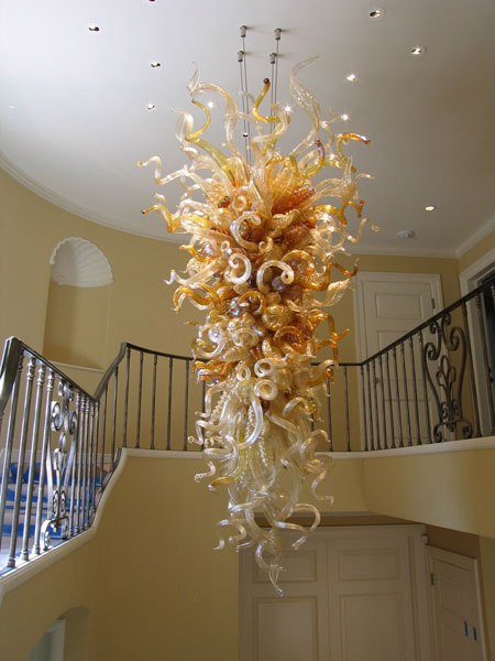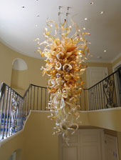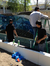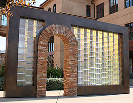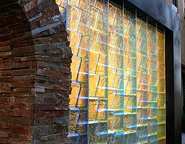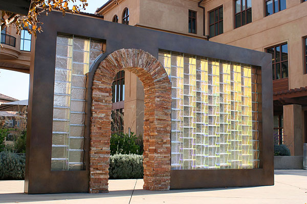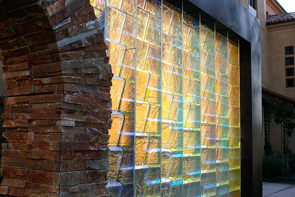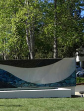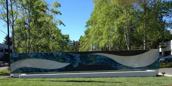 "Blue Cobalt Flow", by Laddie John Dill, 40 feet long, consists of tempered glass, concrete and aircraft aluminum. The artwork is clad to the fountain wall for beautiful viewing by to be seen by drivers in moving vehicles as well as walking pedestrians. |