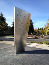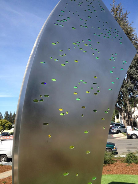 "Receiver" by Daniel Winterich was inspired by the "Blue Cube at Onizuka Air Force Station. The 15' stainless steel and dichroic glass structure has a slight curve similar to a dish antenna. The pattern of the dichroic glass pieces creates a "starry sky" effect that matches the actual star pattern in the sky in Sunnyvale on January 28, 1986, at 11:38 a.m. It was at this exact time in Sunnyvale that the Challenger disaster occurred with Lt. Col. Ellison Onizuka on board. |