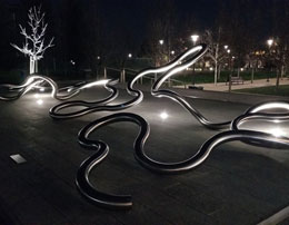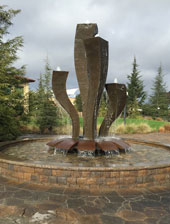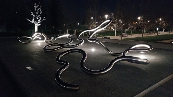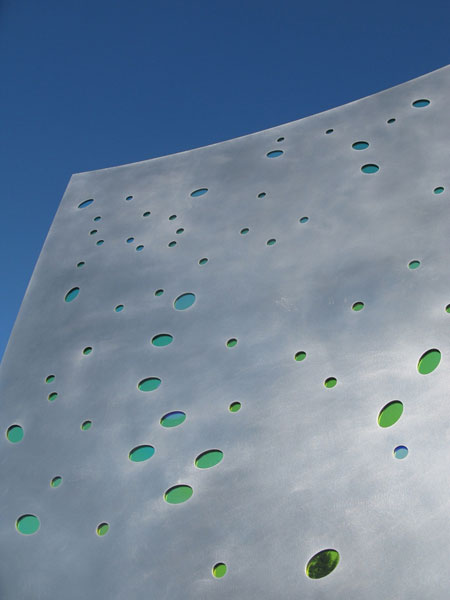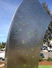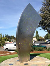 "Crescent", by Daniel Winterich, is a companion piece to "Receiver". "Crescent" was inspired by the sloughs that wind their way through the salt ponds at the southern end of San Francisco Bay. The artist pays homage to this network of waterways that resemble a series of crescent shaped streams sparkling in the sunlight. While "Crescent" is of the waters and earth, "Receiver" is of the sky and stars. |